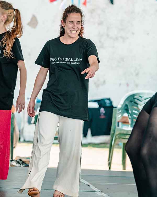La propuesta pedagógica del proyecto PIES DE GALLINA se titula “PIEL DE PLOMO” . El taller consiste en compartir el contenido y proceso de creación de la obra con nuevos cuerpos danzantes. Tendremos como objetivo tocar las bases de creación e investigación del movimiento de PIES DE GALLINA y conformar una composición coreográfica colectiva e itinerante. Tomando como punto de partida algunos de los anclajes de la obra, diseñaremos diferentes frases coreográficas que se moverán por las calles de Zahara de los Atunes en esa misma tarde, como parte de la programación del festival. Son bienvenidos cuerpos que tengan cualquier relación con el movimiento danzado, con interés en la composición coreográfica y en la muestra del taller con el público.